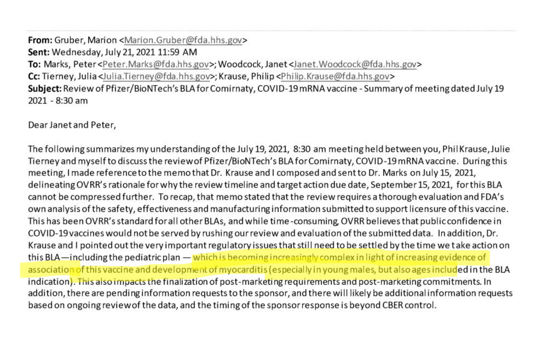This week, internal emails show Marion Gruber, former head of FDA vaccine science frustrated with Marks. She specifically highlighted the myocarditis issue. Myocarditis appears to occur at least 1/10k with boosters, and subclinical troponin elevation is likely 100 times as high (based on 2 studies). This concern was ignored.