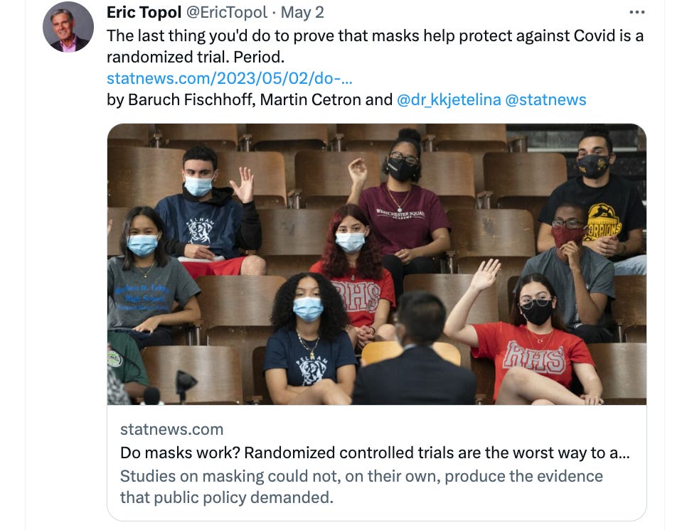 Of course, it should come as no surprise that the article is being amplified by Eric Topol. In a series of posts here, I have described instances where Dr. Topol has promoted incorrect conclusions from academic papers. Given the harms of incorrect inferences, I remain surprised the media quotes him so often. Here he endorses the title that ‘the last thing you’d do to prove masks help protect against covid is a randomized trial’