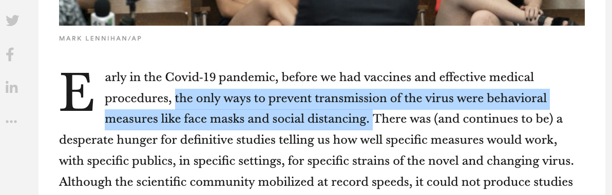 The essay then praises the scientific community but notes “it could not produce studies with desired surety”. This is misleading. The US and UK and WHO and CDC failed to conduct even 1 cluster RCT of masking. Experts went on TV and exaggerated or distorted the evidence, praising cloth masks for years, while failing to run even a single study. Saying we ‘could not produce studies’— should read— we ‘did not try’.