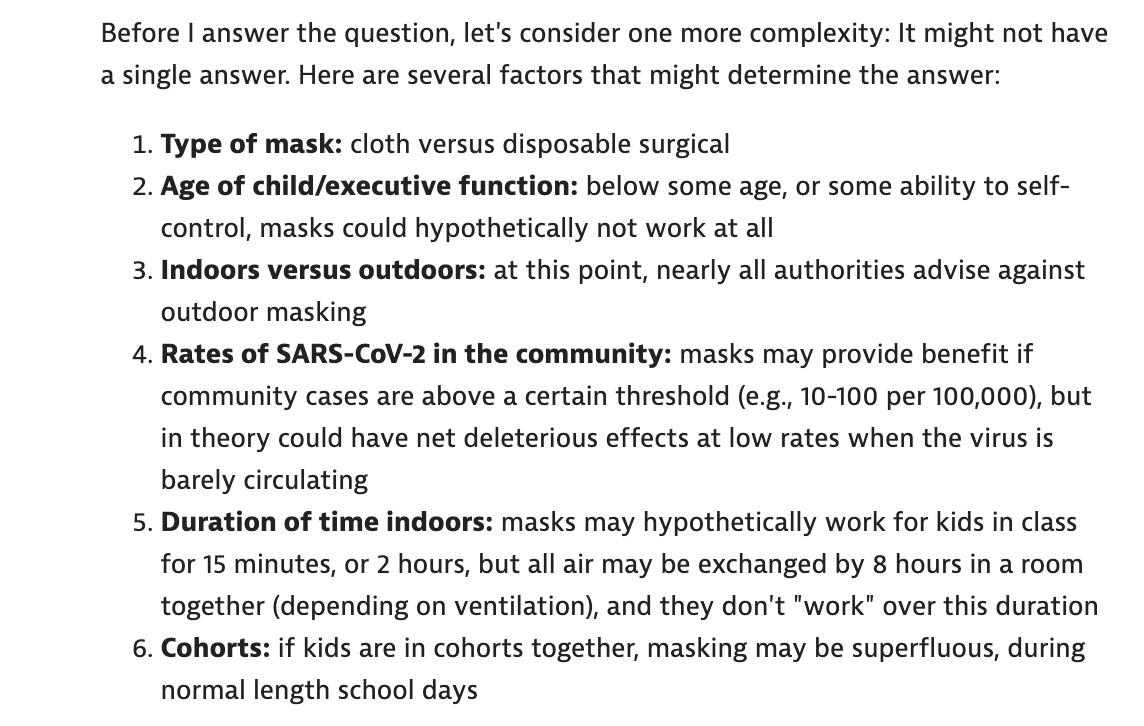 Overall the essay reflects a sophomoric understanding of RCTs. The biggest masking failure was not running more RCTs, under a variety of circumstances, in a variety of locations and settings. This failure falls squarely on leaders at NIAID, CDC, WHO, and UK NHS. But continuing the practice for 3 years, after vaccination, that failure falls on all of us.