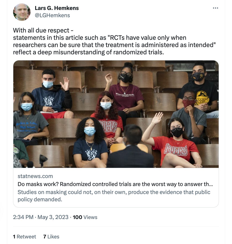 A recent article in STAT has made medical experts groan. Rather than accept Cochrane's meta-analysis of RCTs of masking, the authors wish to abandon randomization entirely. Unfortunately, the essay is riddled with basic misunderstandings about the role of randomized trials. One epidemiologist texted me, “Every paragraph of that article hurt my soul.” Here I will explain why it is problematic.