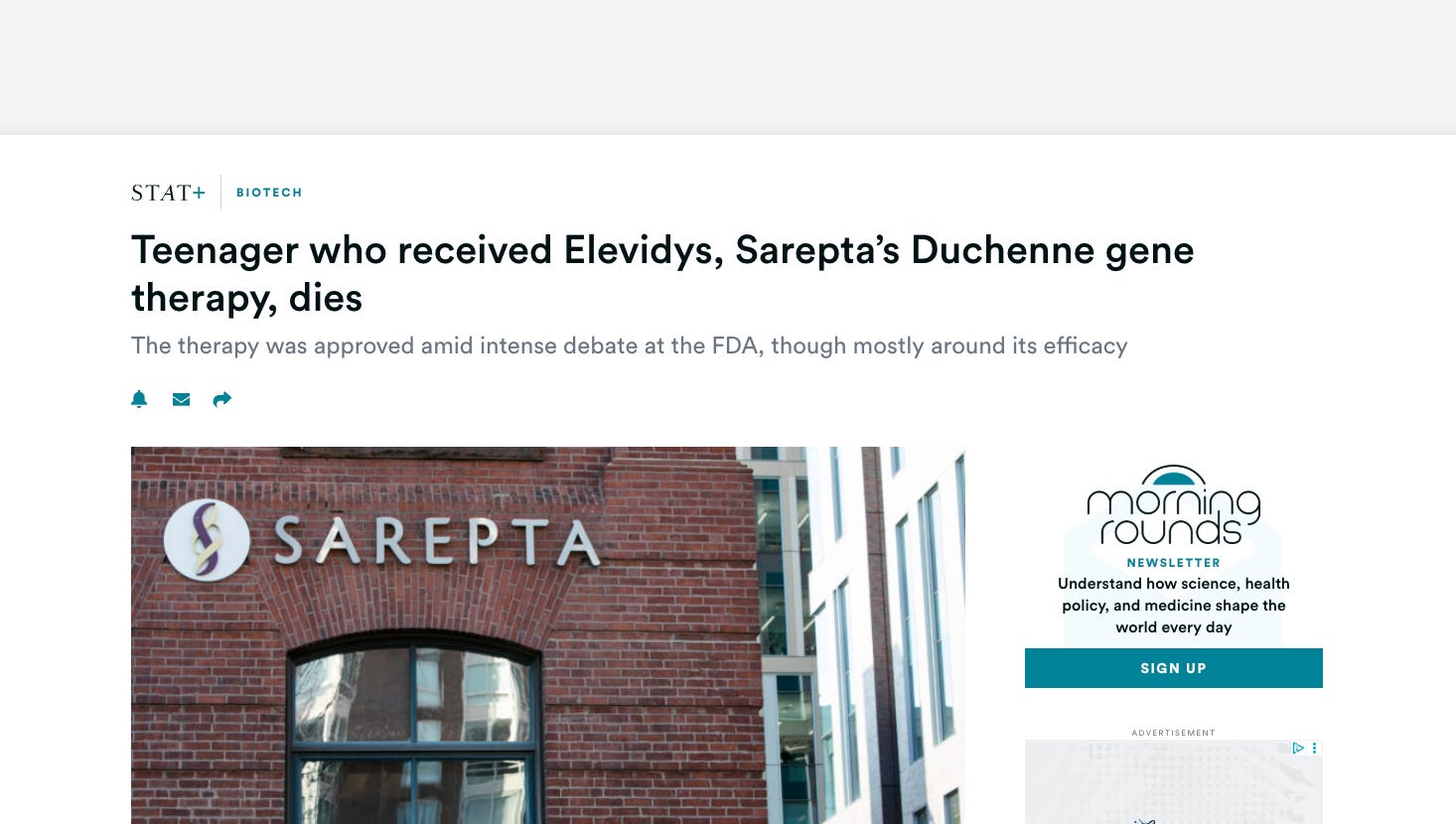 Then to top it all off, Peter was a long time proponent of lowering the bar for gene therapy. Against the advice of 3 FDA scientists on 2 occasions he granted both accelerated and regular approval to Sarepta’s Duchenne’s MD gene therapy. A therapy that has no evidence it helps boys. Sadly, now, at least 1 is dead