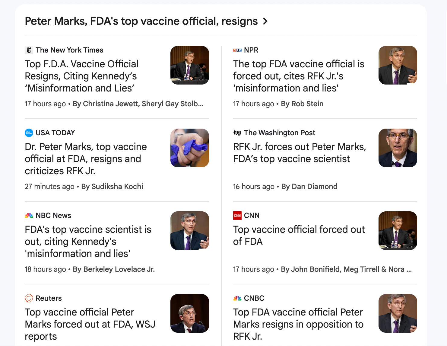 Meanwhile the media is lying about Peter Marks. They state that Marks was pressured to be anti-vax by RFK Jr. Yet, no single specific action is cited. What precisely did RFK Jr ask Marks to do? Some articles even call Marks a hero, and he is praised by past FDA officials who now consult for drug companies or serve on their board.