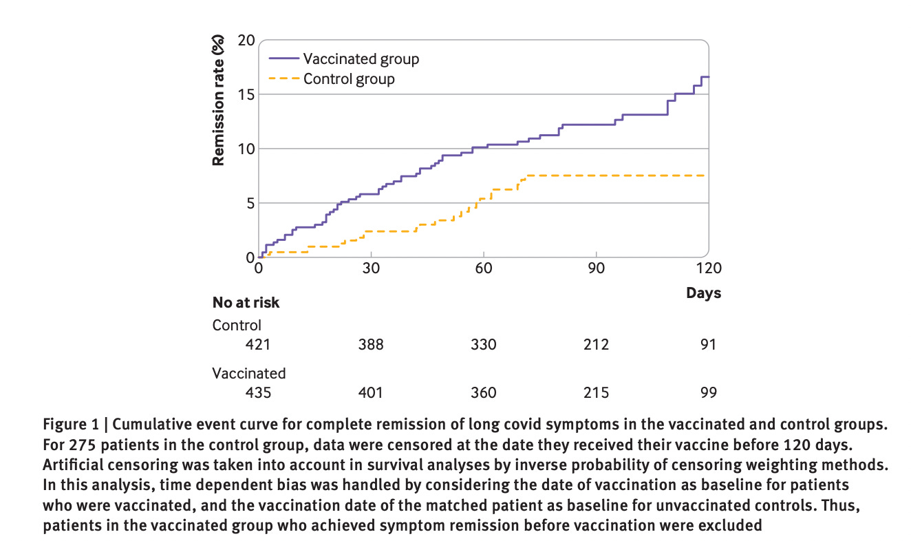 They ask: is vaccination associated with resolution of long covid symptoms? Resolution is defined as the symptoms vanish entirely. Here is the key Figure. This is the remission rate- meaning all long covid symptoms are gone. Just think about it. And look closer.