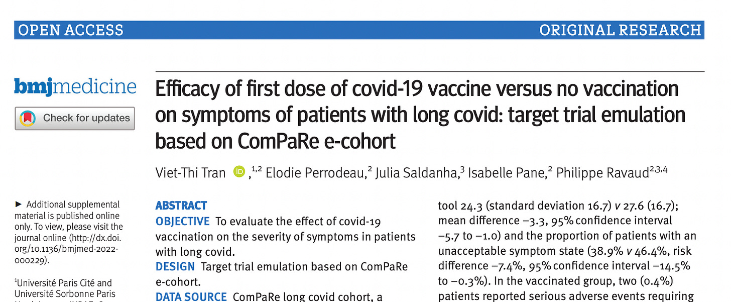 Simply put, the authors take a French dataset of long covid sufferers, and compare people who were vaccinated vs. those who were not with a sophisticated matching method. (Of course, it can’t correct for unmeasured covariates— but we don’t need to go there)